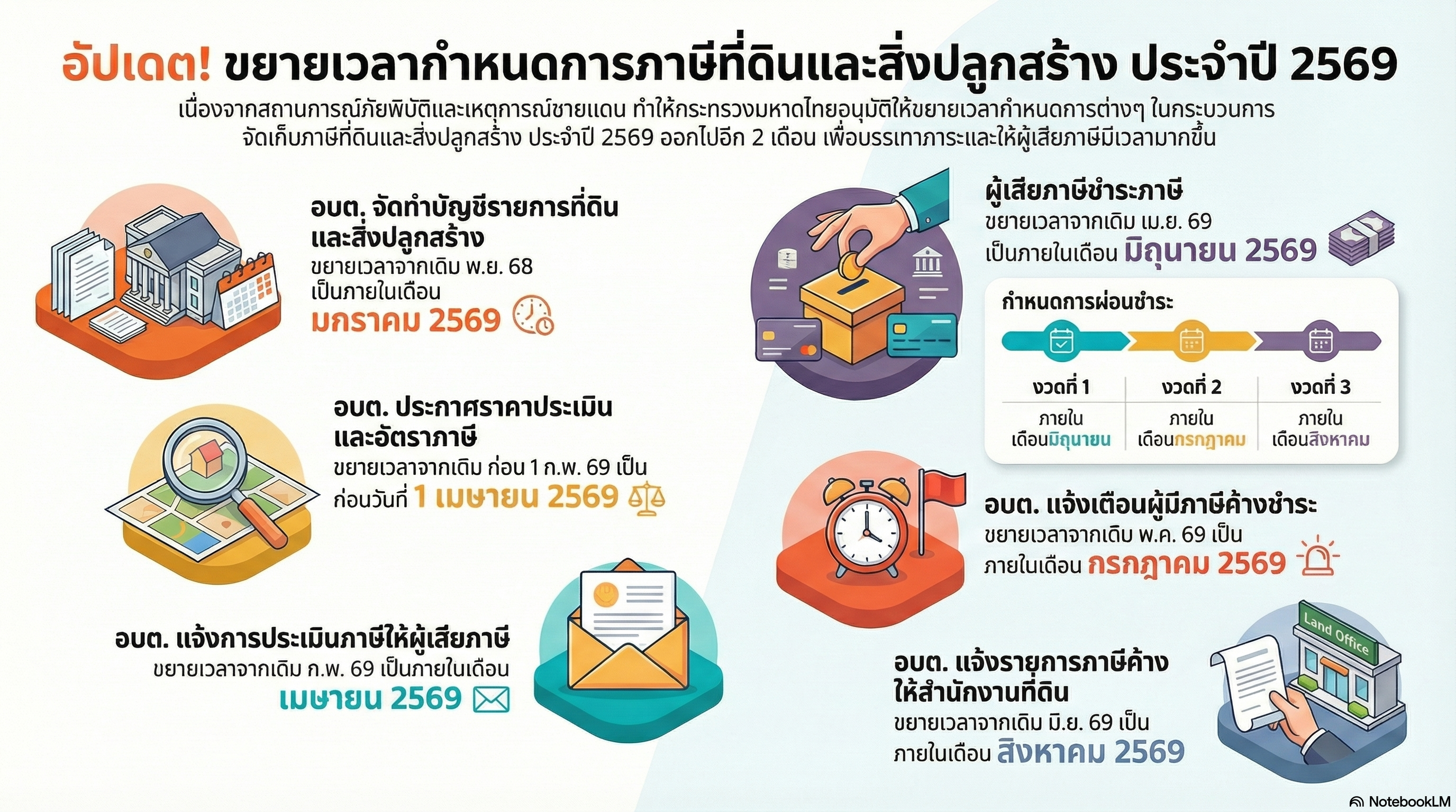 หัวข้อ :: การขยายกำหนดเวลาดำเนินการตามพระราชบัญญัติภาษีที่ดินและสิ่งปลูกสร้าง พ.ศ. 2562 ประจำปี พ.ศ. 2569
